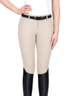 The Equiline Bice Knee X-Grip Breeches are super light, luxurious hunter breeches with Equiline’s X-Grip silicone patterned knees. The Bice Breech from Equiline has a sophisticated and subtle look that is ideal for the hunter and equitation rings and is extremely comfortable for any level of jumping. Women’s knee grip breeches have a low rise, euroseat seam, slash front pockets, and faux flap pockets in the back, one with a small embroidered Equiline horse heads logo. The 1.5″ waistband is designed to lie flat while the 2″ belt loops let you wear all your favorite show belts.