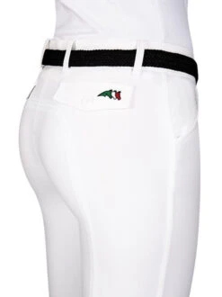 Equiline Italia women’s competition breeches are made in Italy with premium Schoeller fabric that is water and stain repellent, breathable, and moisture wicking. The material maintains its shape and allows maximum stretch for range of motion. Equiline Bice Knee Grip Breeches have a 3.5″ zipper and slide hook closure. Inside the waistband is an elastic band lining that helps keep breeches and shirt in place. Stretch panels at the lower leg allow the perfect fit inside your riding boots. The White and Navy breeches have a small fabric and metal button inset near the knee. The Beige hunter version does not have that detail.