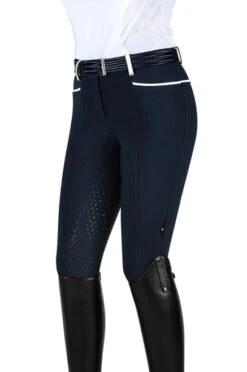 Equiline Italia women’s competition breeches are made in Italy with premium Schoeller fabric that is water and stain repellent, breathable, and moisture wicking. The material maintains its shape and allows maximum stretch for range of motion. Equiline Bice Knee Grip Breeches have a 3.5″ zipper and slide hook closure. Inside the waistband is an elastic band lining that helps keep breeches and shirt in place. Stretch panels at the lower leg allow the perfect fit inside your riding boots. The White and Navy breeches have a small fabric and metal button inset near the knee. The Beige hunter version does not have that detail.