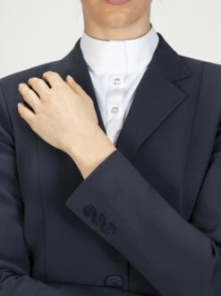 The Equiline Hayley Competition Jacket is a gorgeous luxury equestrian jacket that’s perfect for all your hunter and equitation classes. Equiline Italia competition coat is cut slightly longer than the typical show jumping jacket, giving it a more classic look. The Hayley Coat is hand made in Italy using premium technical fabrics and tailored for a flattering fit. Navy or black hunt coat for women has traditional style with a double vent in back and faux flap pockets in front.