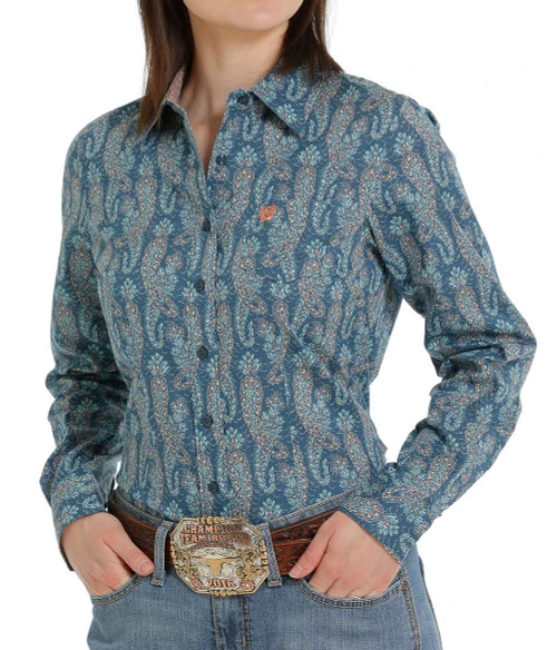 The Cinch Ladies Paisley Blue Shirt has a no-yoke design with princess seams and bust darts for shaping. The cuffs and collar are lined with a coordinating print fabric. High quality Western shirt in 100% cotton offers a great fit and feel. Cinch Paisley Blue Shirt for women has the versatility to be both a show shirt and casual Western shirt.