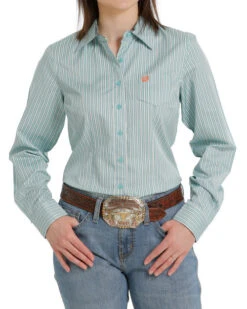 Long sleeve women’s cowgirl shirt has traditional style with a spread collar, button front and cuffs, and contrast trim. There’s a single open pocket with Cinch logo embroidery. Wear the Cinch Tencel Blue Stripe Long Sleeve Shirt with all your favorite jeans and enjoy the comfort and performance plus feminine, flattering fit.