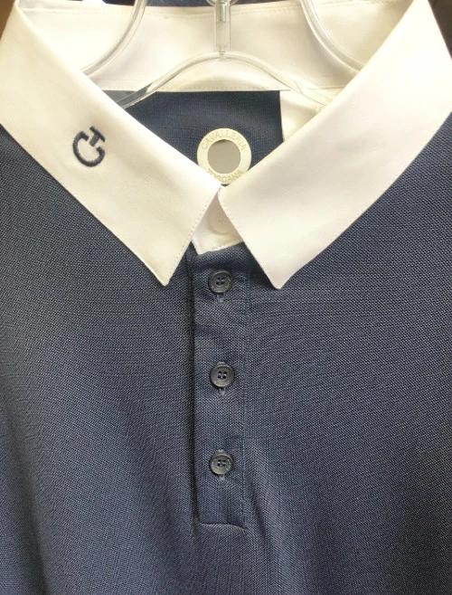 Men’s Competition Polo in Technical Pique from Cavalleria Toscana has excellent natural stretch without spandex. The fabric is anti-UV, antibacterial for odor control, and wicks sweat away from the skin. Men’s short sleeve polo has a unique detail in back, just below the collar. There is a round, flexible open circle, an eyelet with the Cavalleria Toscana name. The small opening might allow in a bit of air but is mostly for flair! Comfortable and stylish Cavalleria Toscana Men’s Pique Competition Polo in either Light Grey or Navy is a great choice for equestrian competitors.