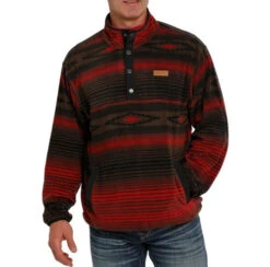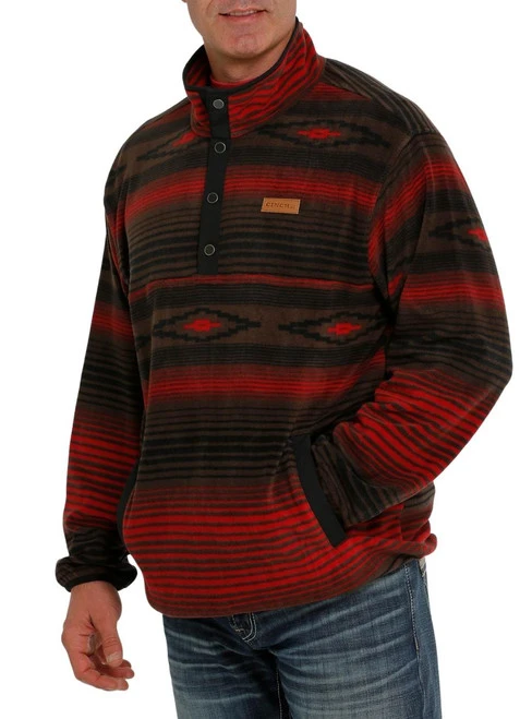 Cinch Men’s Stripe Fleece Pullover has lightweight warmth and classic Southwestern style in handsome brown and red colors that are ready for Fall. Cold weather riding fleece sweater from Cinch is a simple pullover design with half snap placket. The Fleece Pullover gives extra warmth with a standing collar and roomy pockets for warming cold hands. It’s light enough to layer under vests and jackets.