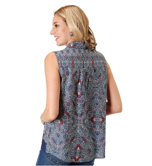 Women’s Roper Tribal Border Print Sleeveless Shirt features rich colors of deep blue, turquoise, white, and red in a vibrant pattern on cool rayon. A wide band of navy blue at the front hem helps ground the lively pattern and adds a nice finishing touch. Ladies sleeveless Western top has a cute silhouette with easy fit that makes it perfect for jeans, shorts, or tights.