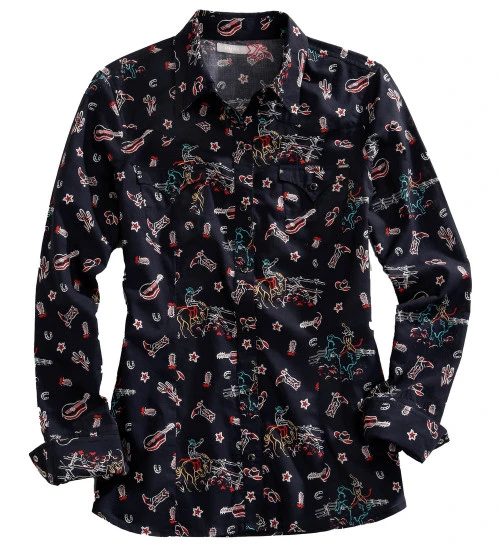 Tin Haul All-Over Ranch Print Snap Shirt has a distinctive all-over print of cowboys, cacti, guitars, cowboy hats, horseshoes, and stars. Cute casual cowgirl wear has a rounded hem, princess seams, and a feminine profile. The lightweight cotton is cool and comfortable and the pattern is wonderful! Mix it up and add this pretty Tin Haul shirt to your everyday wardrobe!